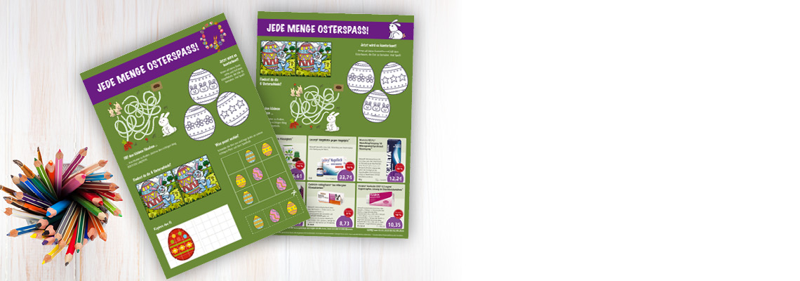 Anfang April können Ihre Kunden wieder auf Eiersuche gehen. Auch in Ihrer Apotheke werden sie fündig – das zeigen Sie Ihren Kunden mit dem neuen Osterhandzettel.